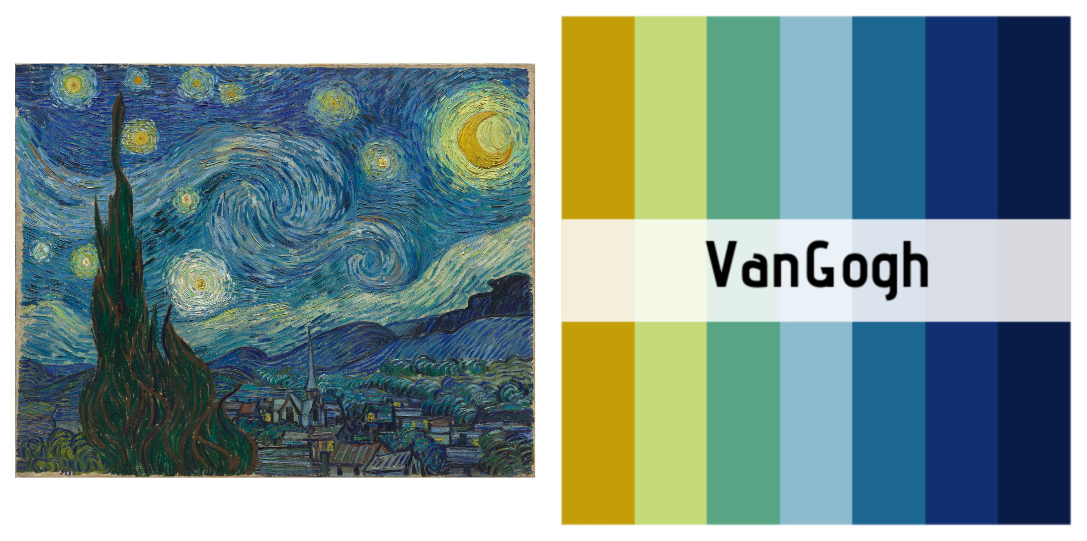Use palettes inspired by works in the Metropolitan Museum of Art and the Museum of Modern Art in New York. There are sequential, diverging, and qualitative palettes, and many are marked as colorblind friendly in {MetBrewer} and {MoMAColors}