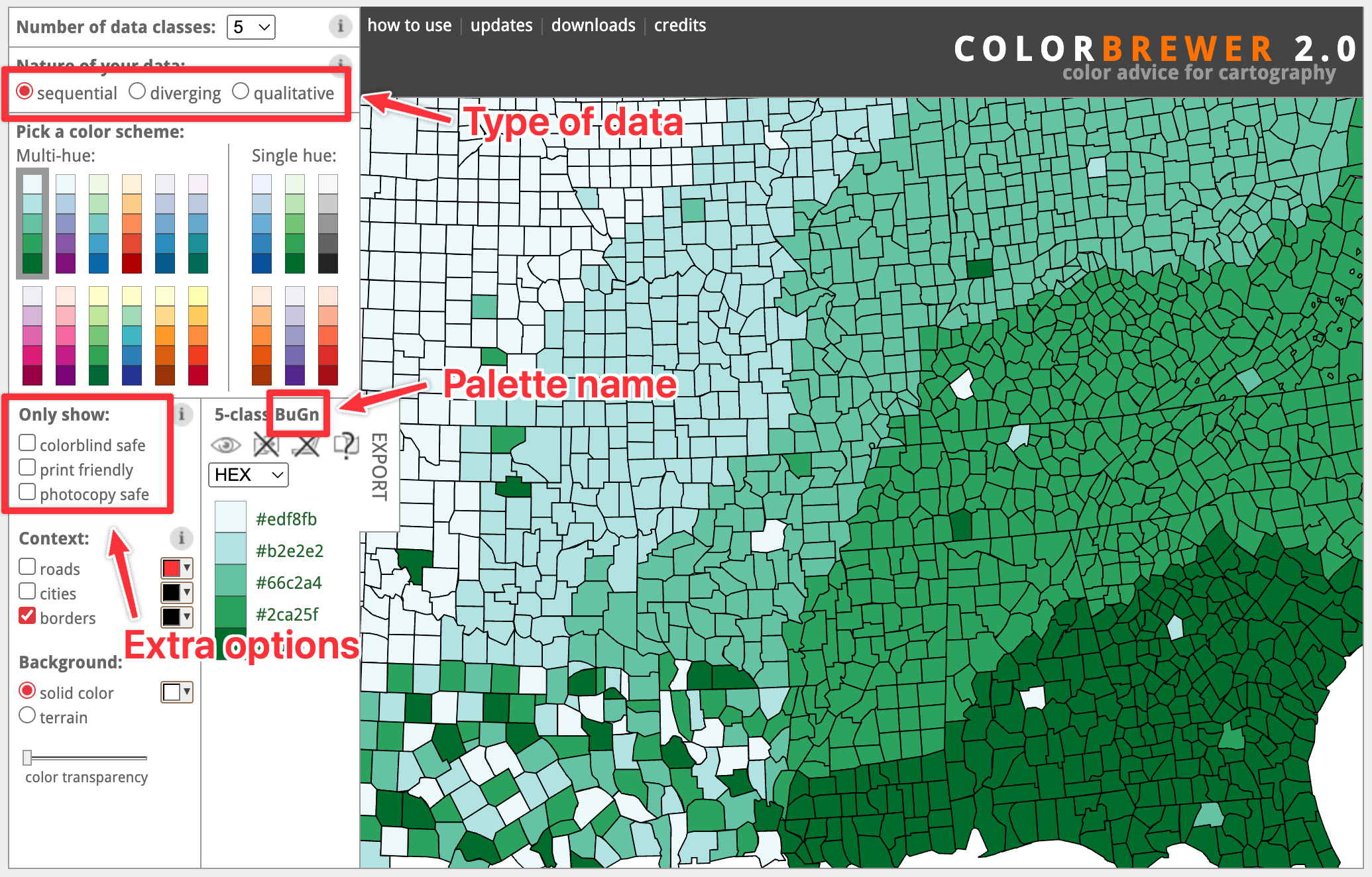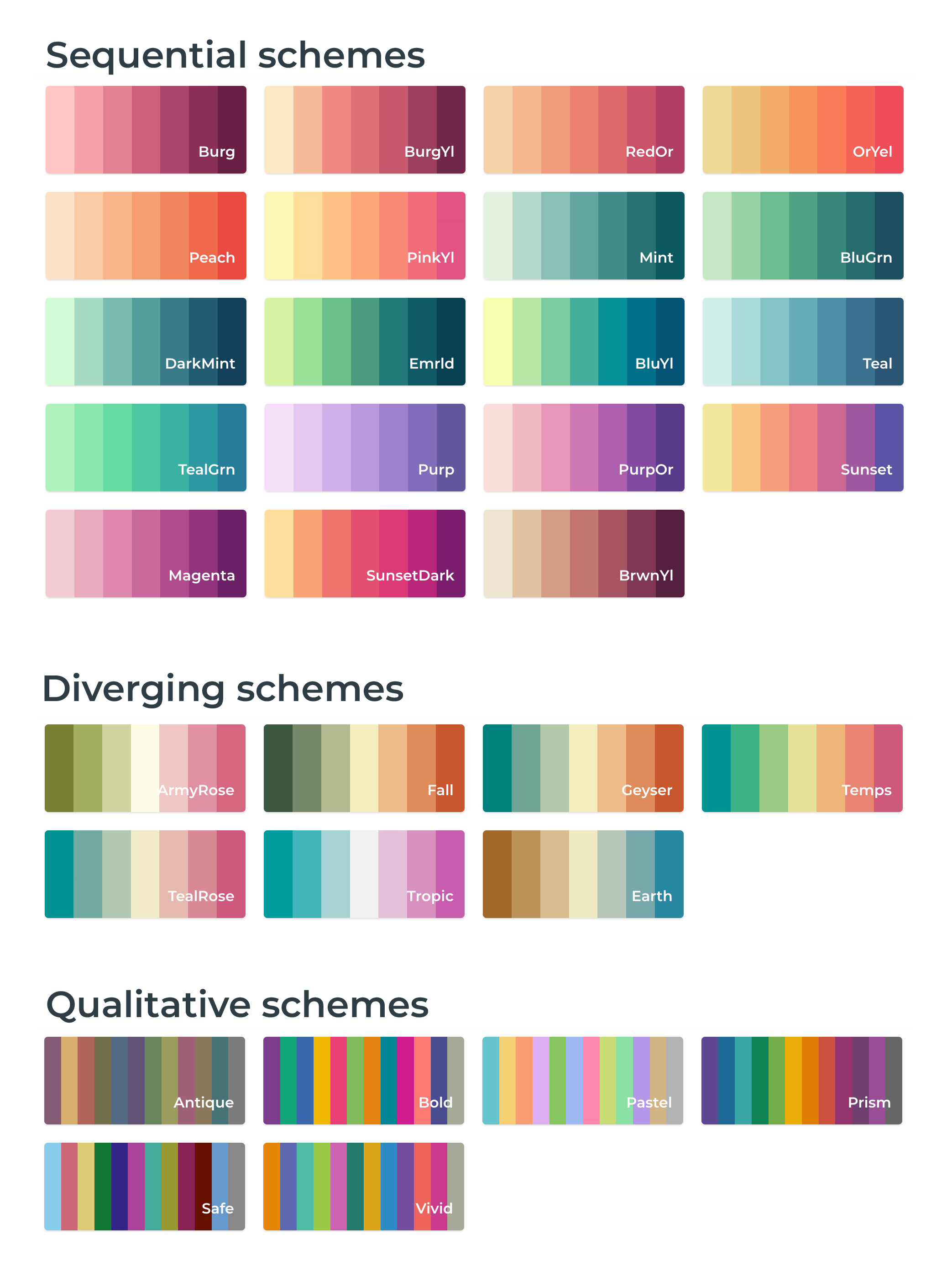 When choosing colors, you need to make sure you work with a palette that mathches the nature of your data. There are three broad categories of color-able data: sequential, diverging, and qualitative.