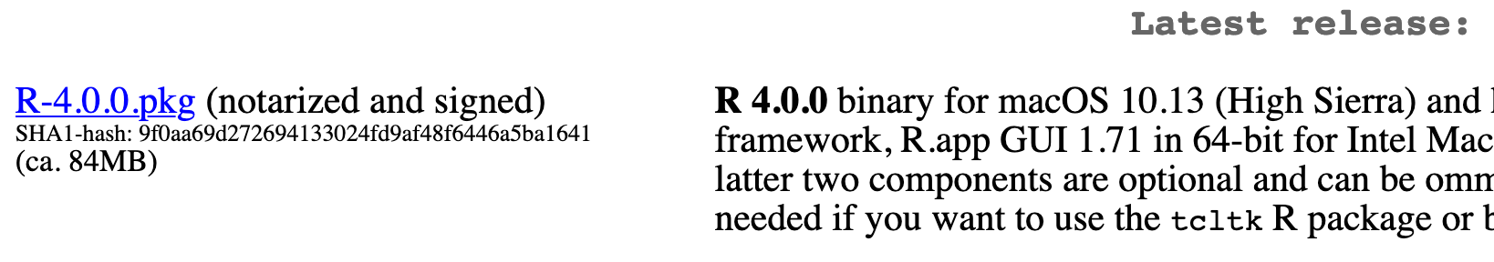 .pkgfile in the list of files (in this picture, it’sR-4.0.0.pkg; as of right now, the current version is 4.3.2) and download it.