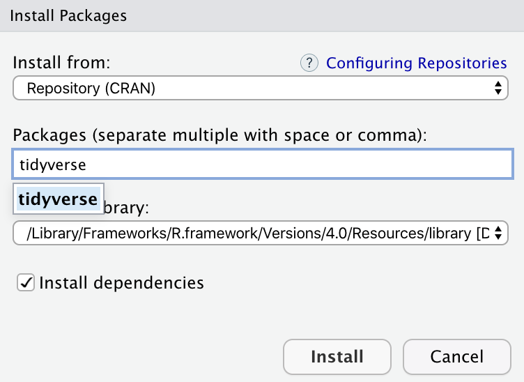 Go to the packages panel in RStudio, click on “Install,” type “tidyverse”, and press enter. You’ll see a bunch of output in the RStudio console as all the tidyverse packages are installed.
