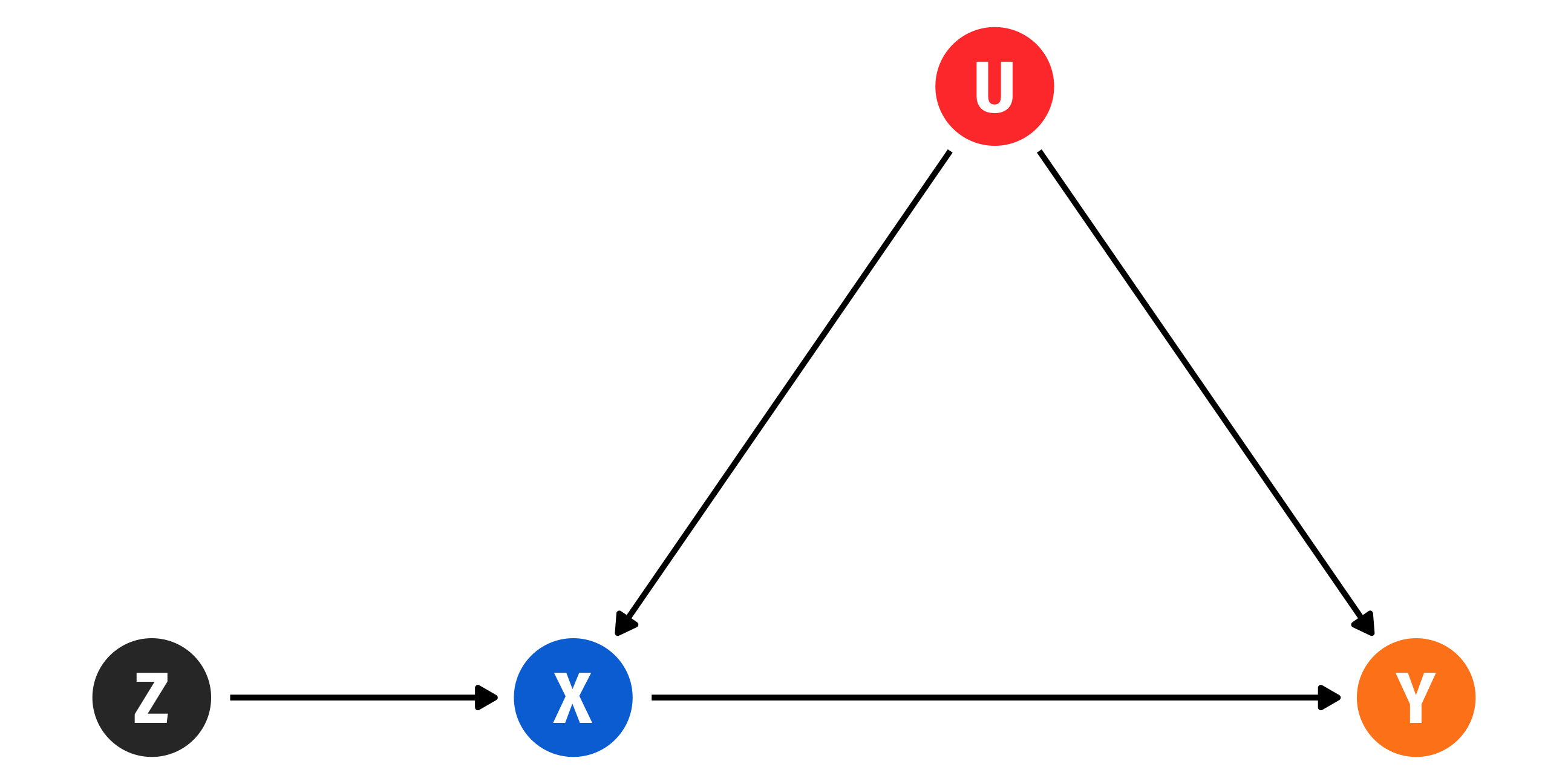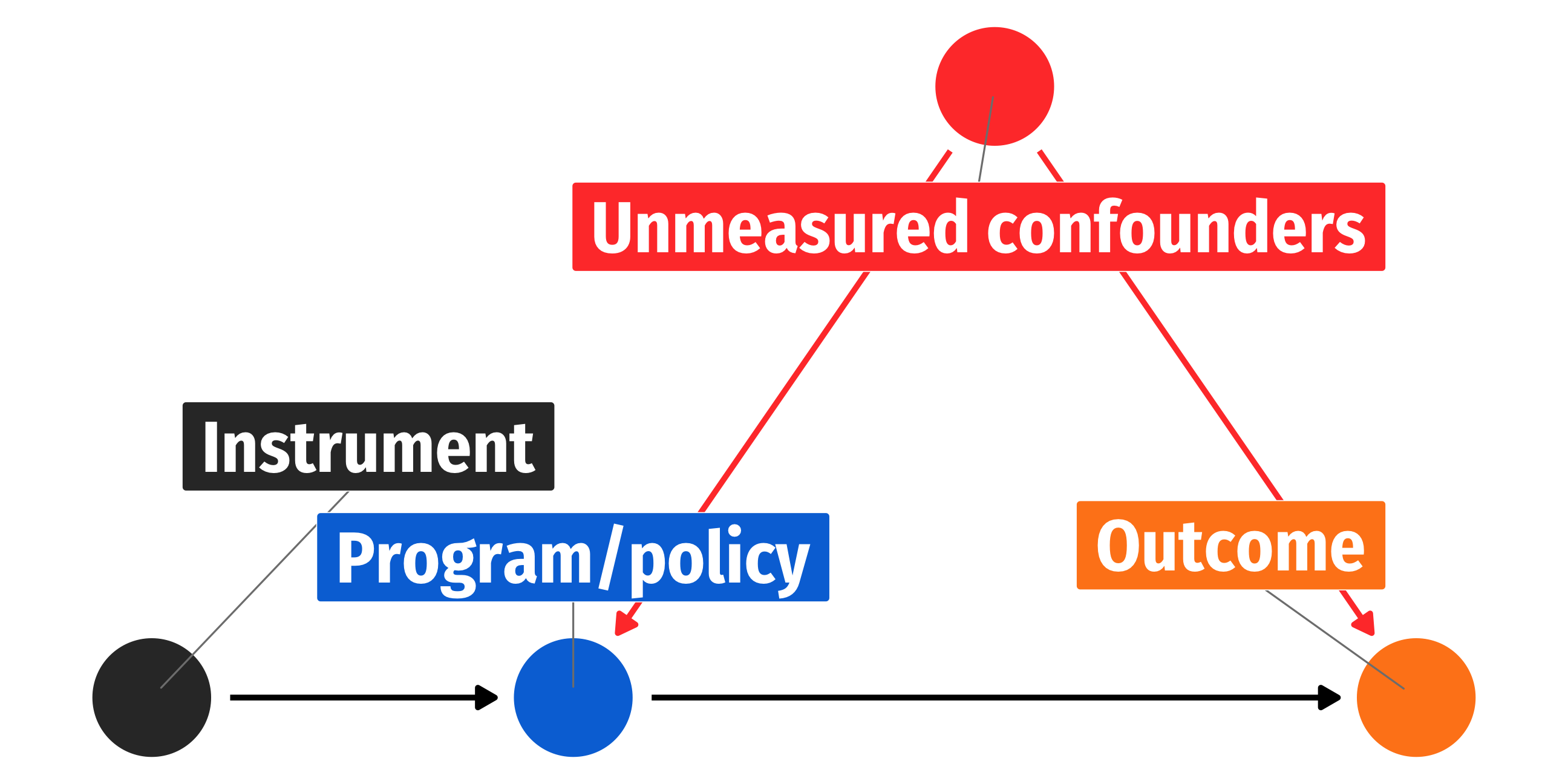 class: center middle main-title section-title-7 # Instrumental<br>variables I .class-info[ **Session 11** .light[PMAP 8521: Program evaluation<br> Andrew Young School of Policy Studies ] ] --- name: outline class: title title-inv-8 # Plan for today -- .box-5.medium.sp-after-half[Endogeneity and exogeneity] -- .box-6.medium.sp-after-half[Instruments] -- .box-3.medium.sp-after-half[Using instruments] --- name: endo-exo class: center middle section-title section-title-5 animated fadeIn # Endogeneity<br>and exoegneity --- layout: true class: title title-5 --- # Does education cause higher earnings? <img src="11-slides_files/figure-html/iv-dag-simple-1.png" alt="" width="70%" style="display: block; margin: auto;" /> -- .medium[ `$$\color{#FF851B}{\text{Earnings}_i} = \beta_0 + \beta_1 \color{#0074D9}{\text{Education}_i} + \varepsilon_i$$` ] --- layout: false .box-inv-5.medium[If we ran this regression, would β<sub>1</sub><br>give us the causal effect of education?] .medium[ `$$\text{Earnings}_i = \beta_0 + \beta_1 \text{Education}_i + \varepsilon_i$$` ] -- .box-5.medium[No!] -- .float-left.center[.box-inv-5[Omitted variable bias!] .box-inv-5[Unclosed backdoors!]] -- .box-inv-5[**Endogeneity!**] --- layout: true class: title title-5 --- # Exogeneity and endogeneity .box-inv-5.medium[**Exogenous** variables] -- .box-5[Value is not determined by<br>anything else in the model] -- .box-5[In a DAG, a node that doesn't<br>have arrows coming into it] --- # Exogeneity .box-inv-5.medium[Education is exogenous: no arrows *into* it] <img src="11-slides_files/figure-html/iv-dag-simple-1.png" alt="" width="100%" style="display: block; margin: auto;" /> --- # Exogeneity and endogeneity .box-inv-5.medium[**Endogenous** variables] -- .box-5[Value is determined by<br>something else in the model] -- .box-5[In a DAG, a node that<br>has arrows coming into it] --- # Endogeneity .box-inv-5.medium[Education is endogenous: Ability → Education] <img src="11-slides_files/figure-html/iv-dag-endogenous-1.png" alt="" width="60%" style="display: block; margin: auto;" /> --- # Exgoeneity .box-inv-5.medium[What would exogenous variation<br>in education look like?] -- .box-5[Choices to get more education that are essentially random<br>(or at least uncorrelated with omitted variables)] --- layout: false .box-5.medium[We'd like education to be exogenous<br>.smaller[(an outside decision or intervention)], but it's not!] <img src="11-slides_files/figure-html/iv-dag-endogenous-1.png" alt="" width="45%" style="display: block; margin: auto;" /> -- .box-inv-5[Part of it is exogenous, but part of it is<br>caused by ability, which is in the DAG] --- class: title title-5 # Fixing endogeneity with DAGs <img src="11-slides_files/figure-html/iv-dag-endogenous-1.png" alt="" width="45%" style="display: block; margin: auto;" /> -- .box-5[Close backdoor and adjust for ability] -- .box-inv-5.smaller[Adjustment filters out the endogenous part of education and leaves us with just the endogenous part] `$$\text{Earnings}_i = \beta_0 + \beta_1 \text{Education}_i + \beta_2 \text{Ability}_i + \varepsilon_i$$` --- .pull-left-wide[ .small[ <table style="NAborder-bottom: 0; width: auto !important; margin-left: auto; margin-right: auto;" class="table"> <thead> <tr> <th style="empty-cells: hide;border-bottom:hidden;" colspan="1"></th> <th style="border-bottom:hidden;padding-bottom:0; padding-left:3px;padding-right:3px;text-align: center; " colspan="2"><div style="border-bottom: 1px solid #ddd; padding-bottom: 5px; ">Outome = wage</div></th> </tr> <tr> <th style="text-align:left;"> </th> <th style="text-align:center;"> Unadjusted </th> <th style="text-align:center;"> Adjusted </th> </tr> </thead> <tbody> <tr> <td style="text-align:left;"> (Intercept) </td> <td style="text-align:center;"> −59.378*** </td> <td style="text-align:center;"> −85.571*** </td> </tr> <tr> <td style="text-align:left;"> </td> <td style="text-align:center;"> (10.376) </td> <td style="text-align:center;"> (7.198) </td> </tr> <tr> <td style="text-align:left;background-color: rgba(255, 198, 198, 255) !important;"> educ </td> <td style="text-align:center;background-color: rgba(255, 198, 198, 255) !important;"> 13.124*** </td> <td style="text-align:center;background-color: rgba(255, 198, 198, 255) !important;"> 7.767*** </td> </tr> <tr> <td style="text-align:left;"> </td> <td style="text-align:center;"> (0.618) </td> <td style="text-align:center;"> (0.456) </td> </tr> <tr> <td style="text-align:left;"> ability </td> <td style="text-align:center;"> </td> <td style="text-align:center;"> 0.344*** </td> </tr> <tr> <td style="text-align:left;box-shadow: 0px 1.5pxborder-bottom: 1px solid"> </td> <td style="text-align:center;box-shadow: 0px 1.5pxborder-bottom: 1px solid"> </td> <td style="text-align:center;box-shadow: 0px 1.5pxborder-bottom: 1px solid"> (0.010) </td> </tr> <tr> <td style="text-align:left;"> Num.Obs. </td> <td style="text-align:center;"> 1000 </td> <td style="text-align:center;"> 1000 </td> </tr> <tr> <td style="text-align:left;"> R2 </td> <td style="text-align:center;"> 0.311 </td> <td style="text-align:center;"> 0.673 </td> </tr> <tr> <td style="text-align:left;border-bottom: 1px solid"> RMSE </td> <td style="text-align:center;border-bottom: 1px solid"> 39.13 </td> <td style="text-align:center;border-bottom: 1px solid"> 26.97 </td> </tr> </tbody> <tfoot><tr><td style="padding: 0; " colspan="100%"> <sup></sup> + p < 0.1, * p < 0.05, ** p < 0.01, *** p < 0.001</td></tr></tfoot> </table> ] ] .pull-right-narrow[ .box-2[Unadjusted<br>is wrong!] .box-5[Adjusted<br>is right!] .box-inv-5.small[One year of education causes hourly wage to increase by $7.77] .box-inv-5.smaller[(FAKE DATA)] ] --- layout: true class: title title-5 --- # But we can't measure ability! <img src="11-slides_files/figure-html/iv-dag-endogenous-confounding-1.png" alt="" width="40%" style="display: block; margin: auto;" /> `$$\color{#FF851B}{\text{Earnings}_i} = \beta_0 + \beta_1 \color{#0074D9}{\text{Educat